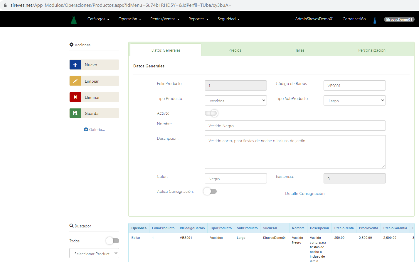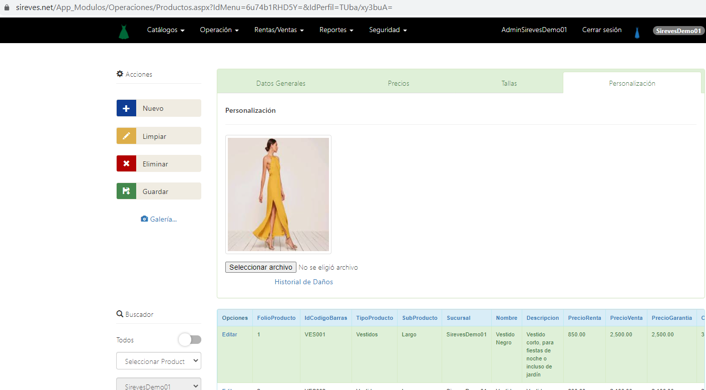 Es el módulo donde se capturan todos los productos que se van a manejar en la boutique para la renta o venta, ejemplos: